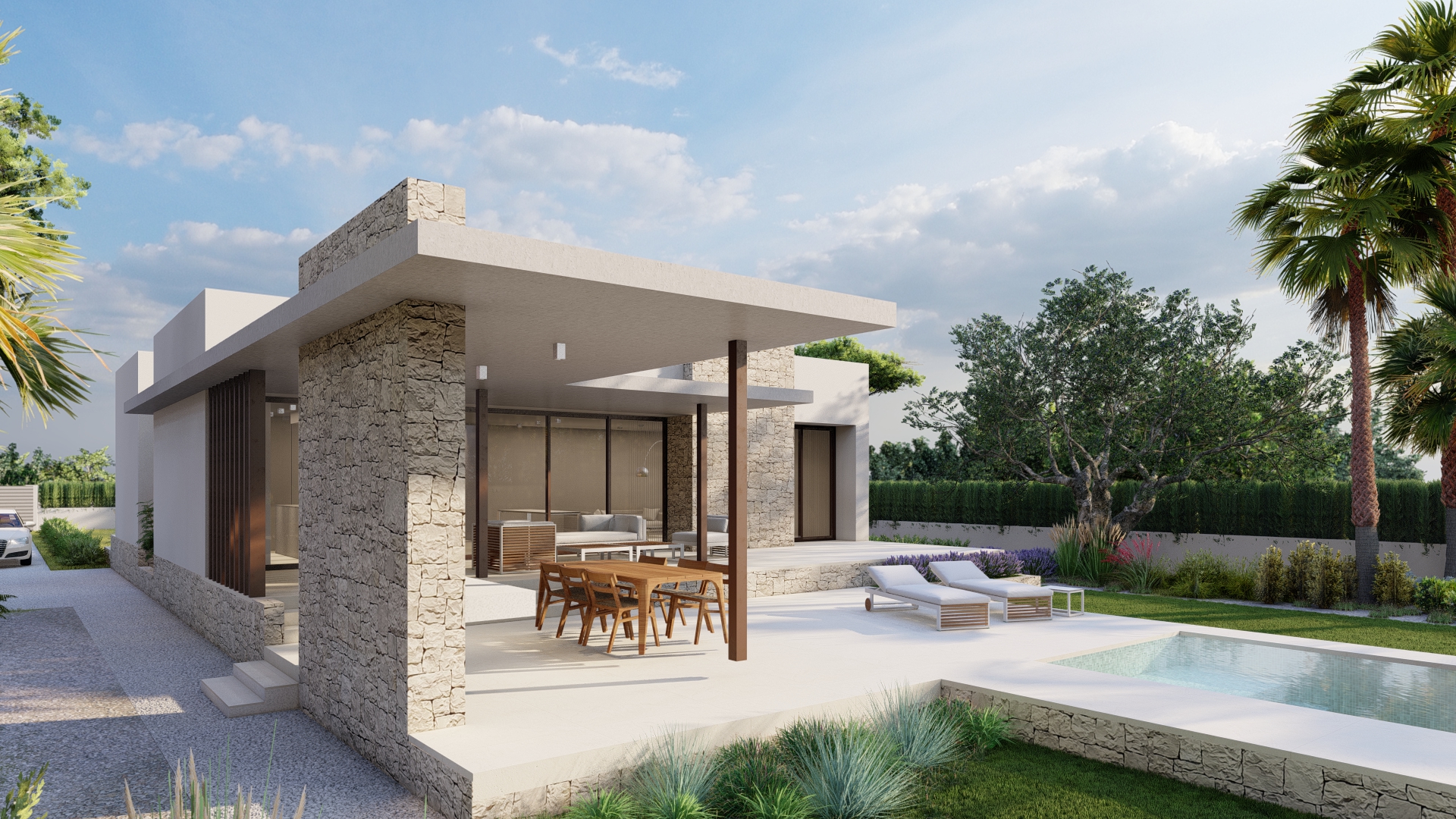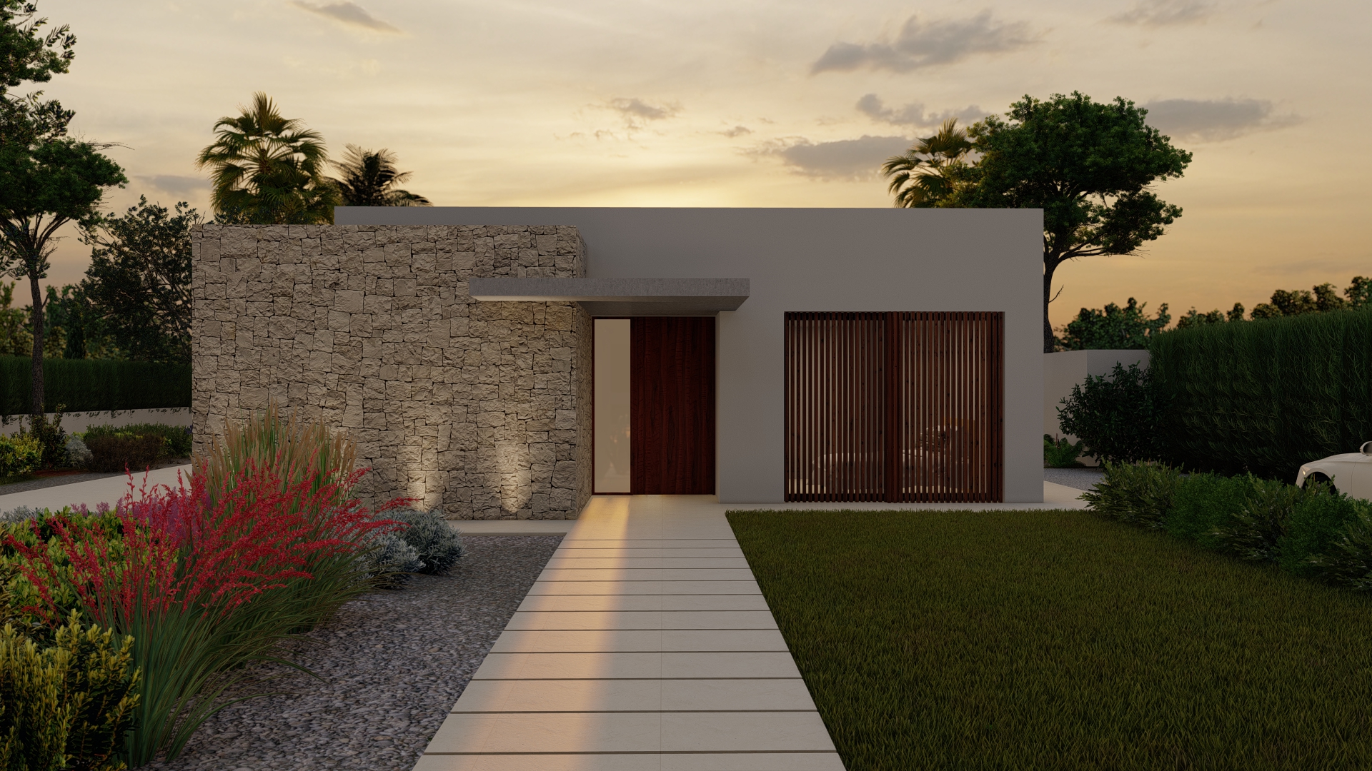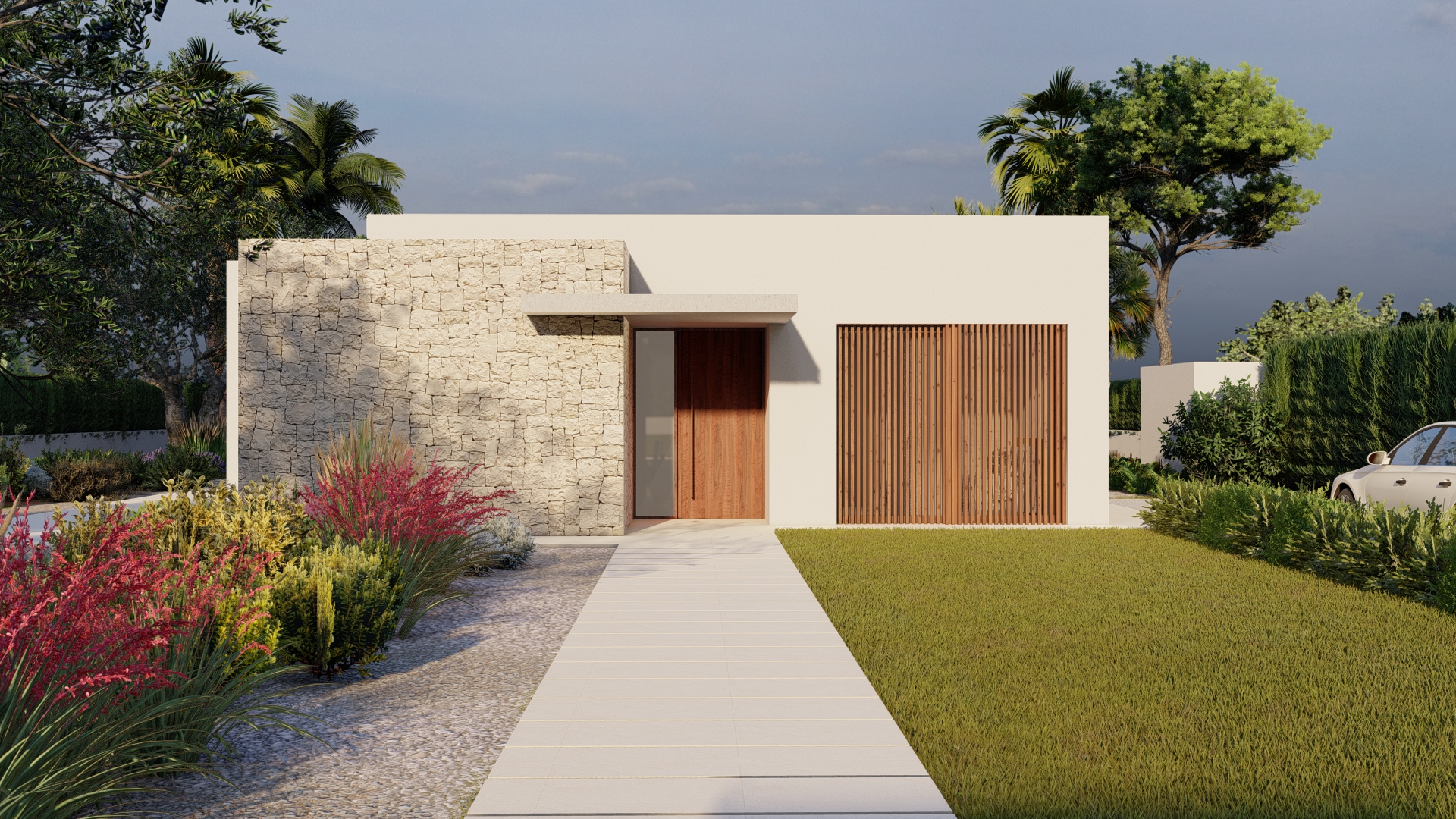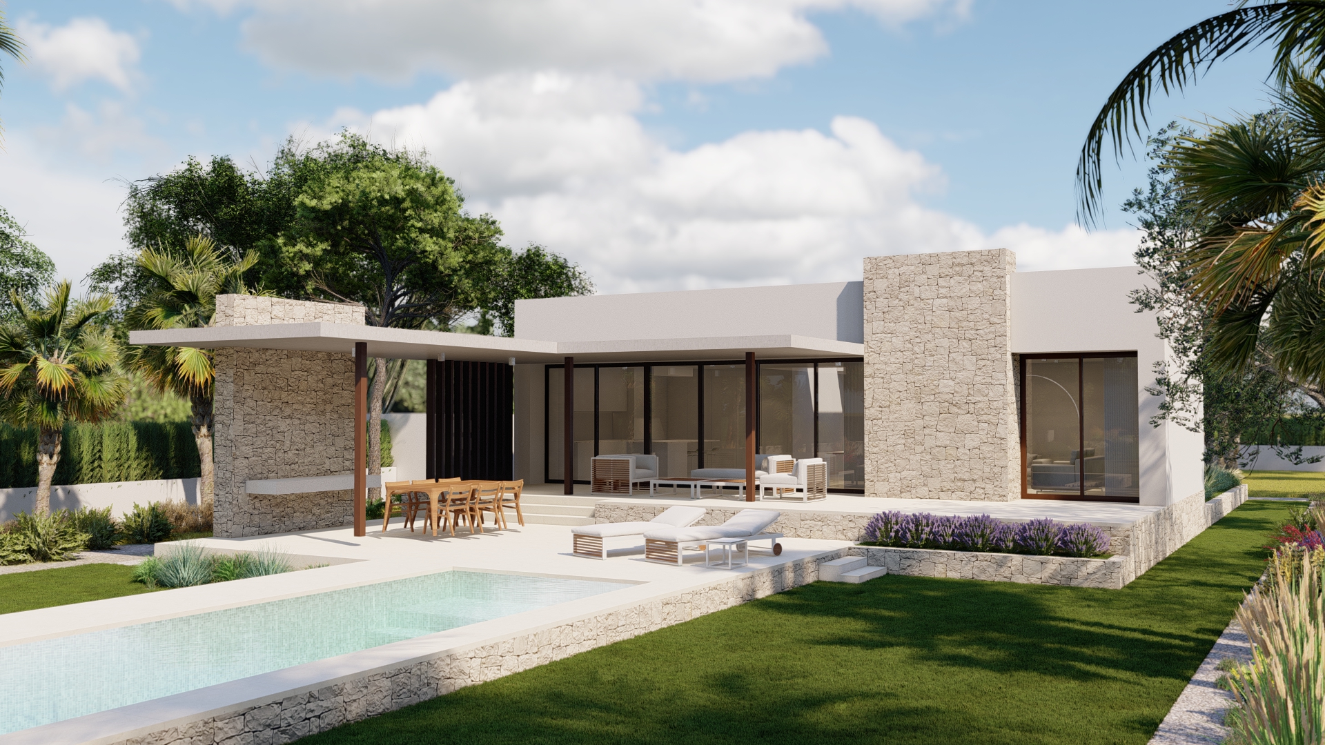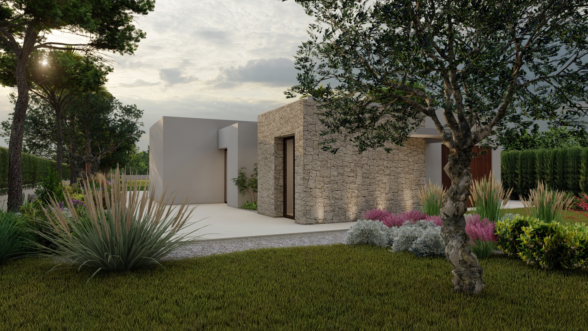 This detached single-storey home in Jávea is designed to centre around its rear outdoor space, where a pool becomes the focal point of the exterior. A barbecue embraces the outdoor terrace, conceived as an extension of the living room.