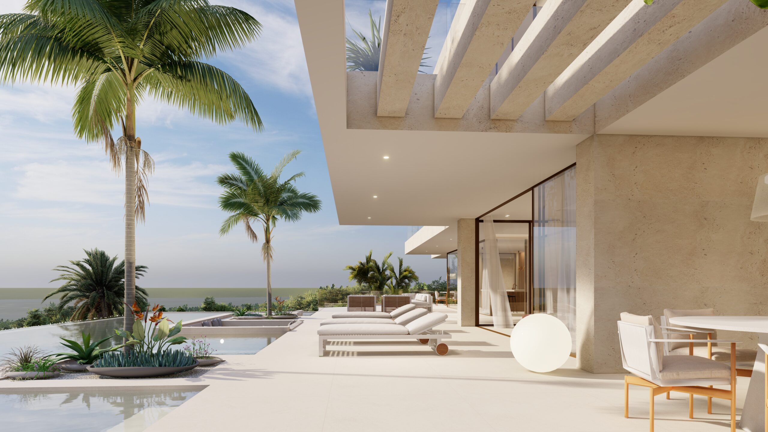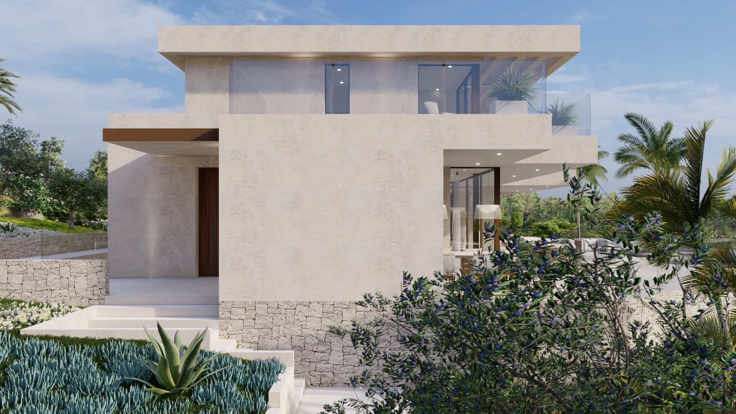 The façade’s materiality features travertine and ceramic flooring, unifying interior and exterior spaces in a continuous gesture. Large floor-level windows capture the morning light, bathing the interiors in a serene and luminous atmosphere.