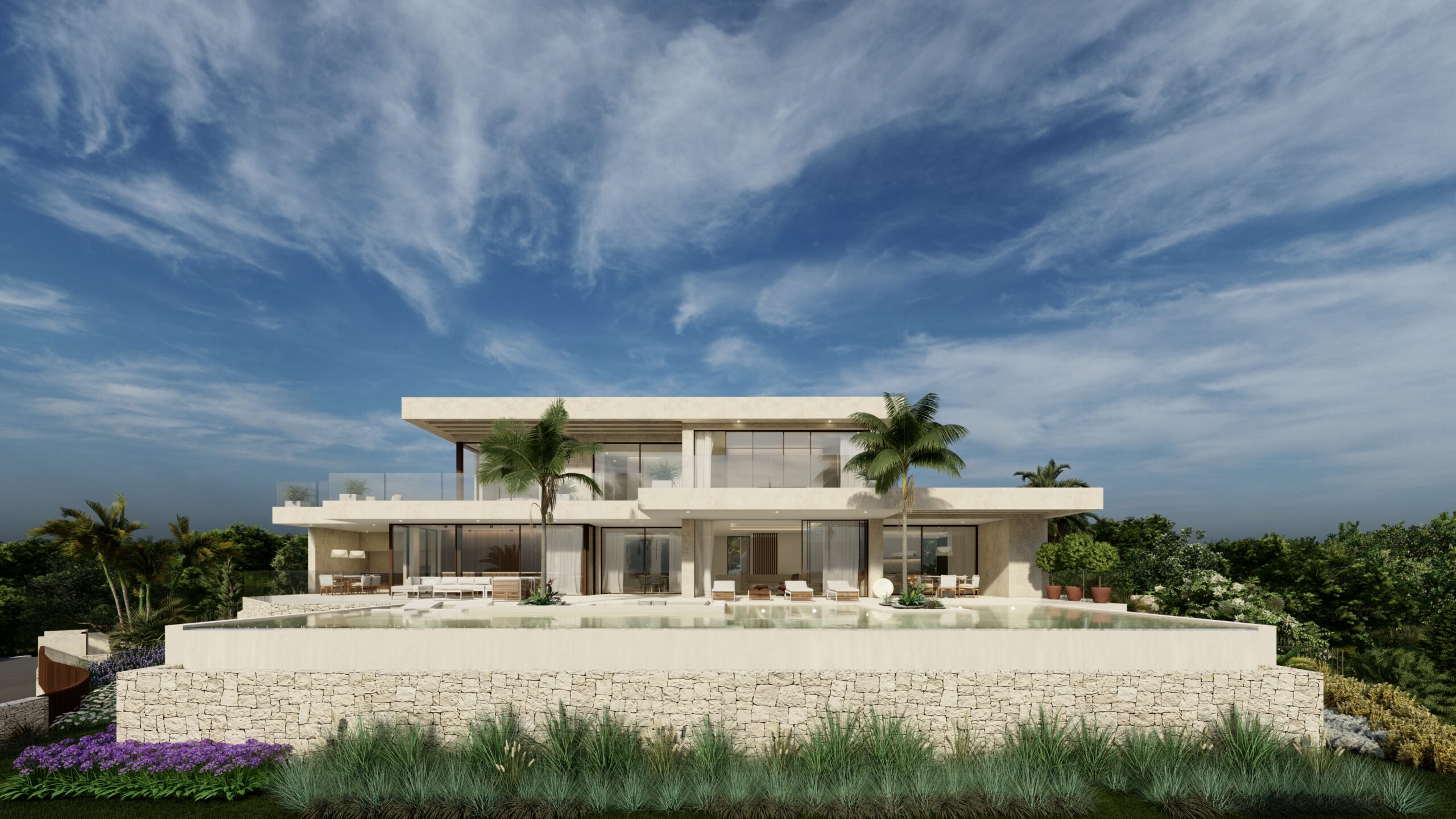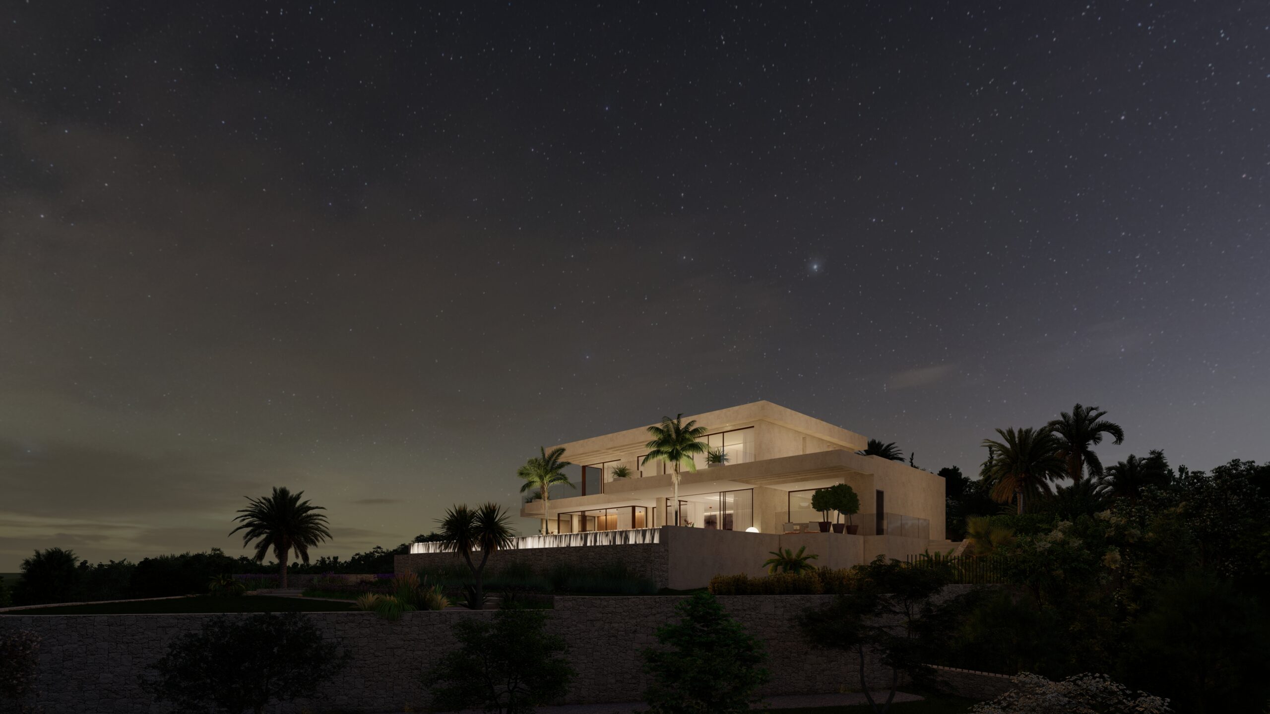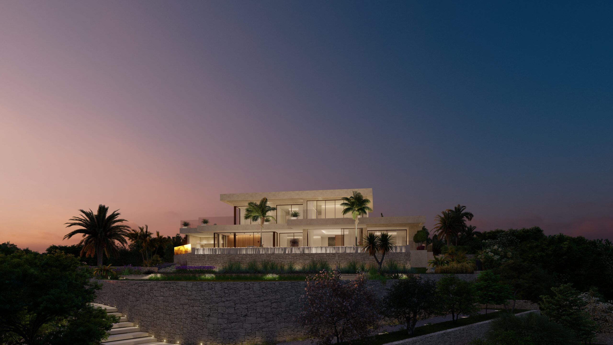 In a privileged setting atop the Montgó hillside, this detached home opens towards the sea, embracing the panoramic views and the unmistakable breeze of Jávea’s bay. The project, spread across three levels, harmoniously interacts with the natural environment, blending into the native vegetation and preserving the historic terraced fields that echo the region’s agricultural heritage.