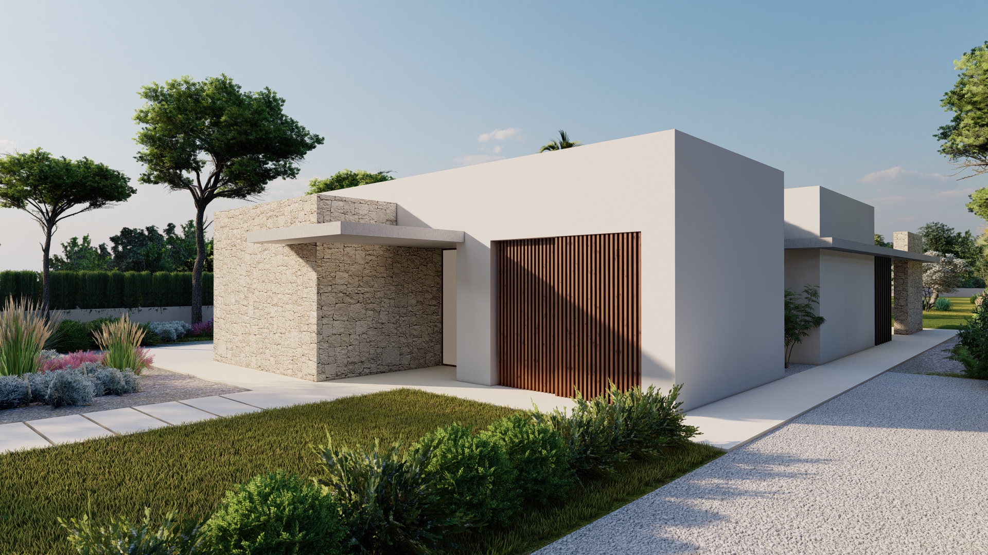 La propuesta se articula mediante volúmenes que se expanden y retranquean generando nuevos espacios interiores y exteriores. Las carpinterías se protegen del calor estival mediante protecciones solares fijas y correderas de hormigón y madera.