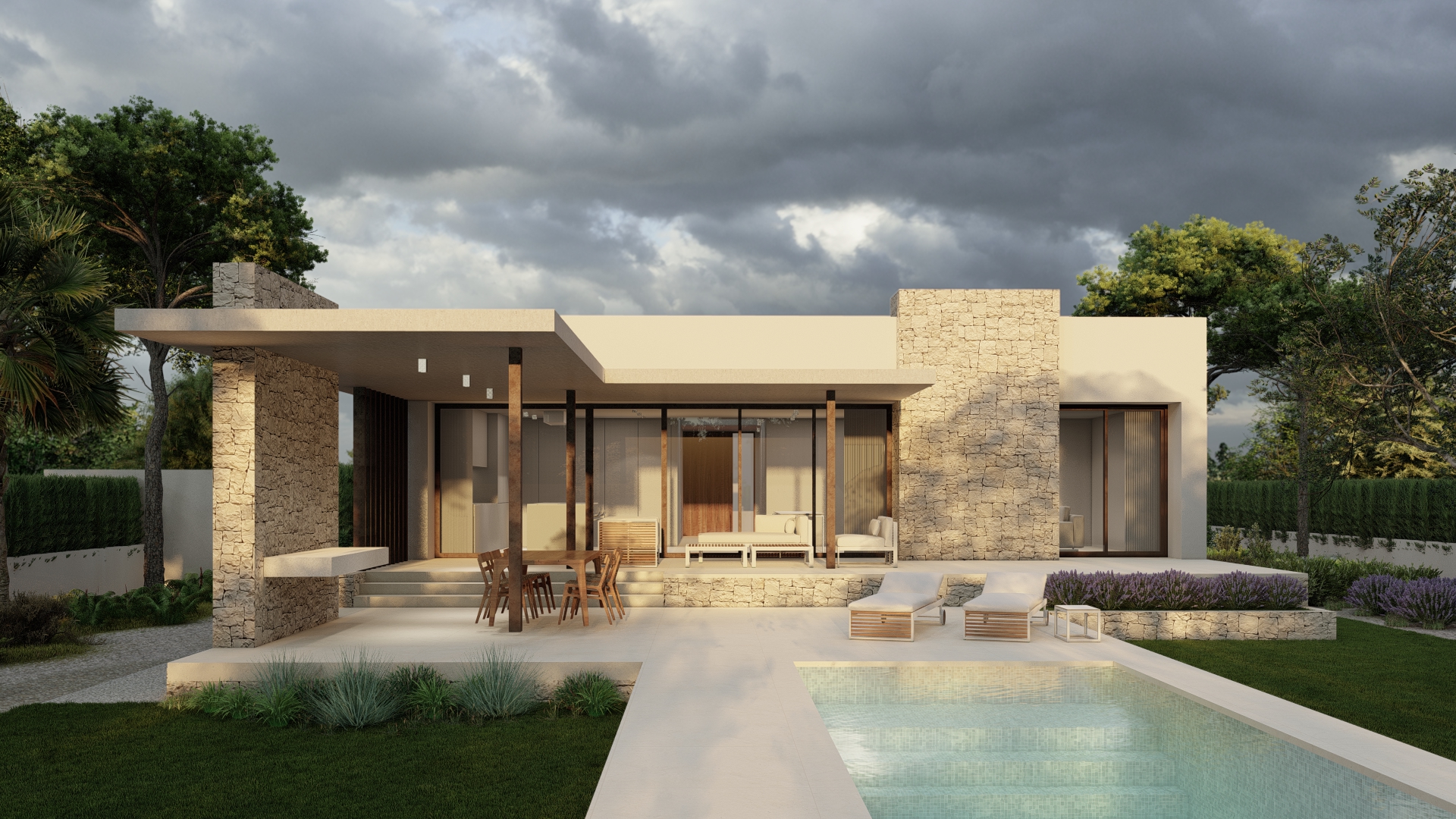 Vivienda unifamiliar en Javea aislada en una planta enfocada al espacio trasero de la misma donde una piscina marca el espacio exterior.